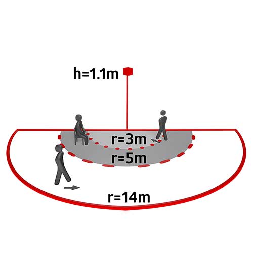 Für Anwendungen mit überwiegend radialen Bewegungen wurde der IndoorHF entwickelt. Er arbeitet mit moderner 60-GHz-Hochfrequenztechnologie und bietet eine gleichmäßige, rechteckige Erfassung von 8 x 4 Metern. Damit eignet er sich ideal für Korridore, in denen der Melder am Flurende montiert wird. Die hohe Frequenz reduziert zudem die Durchdringung von Materialien wie Glas, Holz oder Gipswänden deutlich im Vergleich zu herkömmlichen 5,8-GHz-HF-Sensoren – ein klarer Vorteil in modernen Gebäudestrukturen, welche sonst zu Fehlschaltungen führen können.