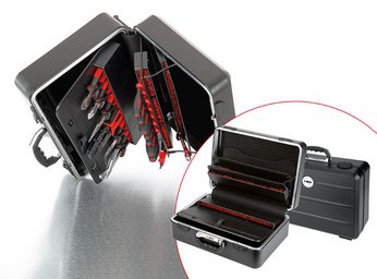 Der formschöne, stabile und robuste Hartschalenkoffer „Perfekt“ (CIMCO-Artikelnr. 17 5075) ist mit 3 Werkzeugtafeln ausgestattet, die 4 Einsteckleisten und ein Dokumentenfach bieten. Die Bodenschale mit Rasteraufteilung und Trennstegen bringt Messgeräte und Kleinteile sicher unter.