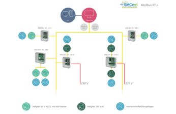 Am MB-DIOx/y-IP65 von METZ CONNECT können Stellglieder mit AMP-Steckern (Marke von TE Connectivity) direkt angeschlossen werden. Je nach Betriebsart kann das Modul mit Modbus Standard-Register oder mit BACnet-Objekte geschaltet oder abgefragt werden. Für die manuelle Steuerung sind die Relaisausgänge mit Schalter ausgestattet. Die Einstellungen der Betriebsart, Bitrate und Parität erfolgt über zwei Drehschalter oder per Software.