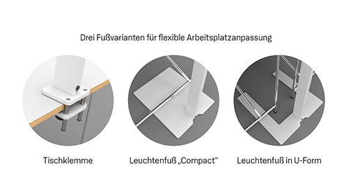 - Drei wählbaren Fußvarianten: Leuchtenfuß „Compact“, „U-Form“ oder Tischklemme