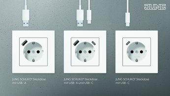 Gegen das Durcheinander an Ladegeräten gibt es jetzt eine platzsparende Lösung: JUNG SCHUKO® Steckdosen mit integrierten USB-Anschlüssen. Sie bieten die Möglichkeit, Mobilgeräte aufzuladen und gleichzeitig die Steckdose zu nutzen. Die Variante JUNG Quick Charge mit Schnellladefunktion hat entweder einen USB-A- oder USB-C-Anschluss. Sie stellt eine Leistung von 18 Watt bereit und lädt Mobilgeräte besonders schnell auf. So ist beispielsweise ein iPhone 11 in nur 105 Minuten komplett wieder aufgeladen. Daneben bietet JUNG SCHUKO® Steckdosen mit zwei USB-Anschlüssen an (Typ A und Typ C). Sie sind die optimale 3-in-1-Lösung zum Laden mobiler Endgeräte. Sind mehrere Verbraucher gleichzeitig angeschlossen, teilt sich der Ladestrom gleichmäßig auf 1,5 Ampere pro USB-Buchse auf. Die Steckdose bleibt frei für andere Zwecke. Die neuen JUNG SCHUKO® Steckdosen mit USB-Ports sind „Made in Germany“ und VDE-zertifiziert. Alle USB-Steckdosen haben den bewährten integrierten erhöhten Berührungsschutz und garantieren damit besondere Sicherheit. Beide Varianten der USB-Steckdose lassen sich problemlos mit bestehenden Steckdosen austauschen. Die SCHUKO® Steckdosen mit USB sind mit den JUNG Rahmen und Abdeckungen der Serien A und LS erhältlich. So lassen sie sich optimal an die übrige Elektroinstallation anpassen.